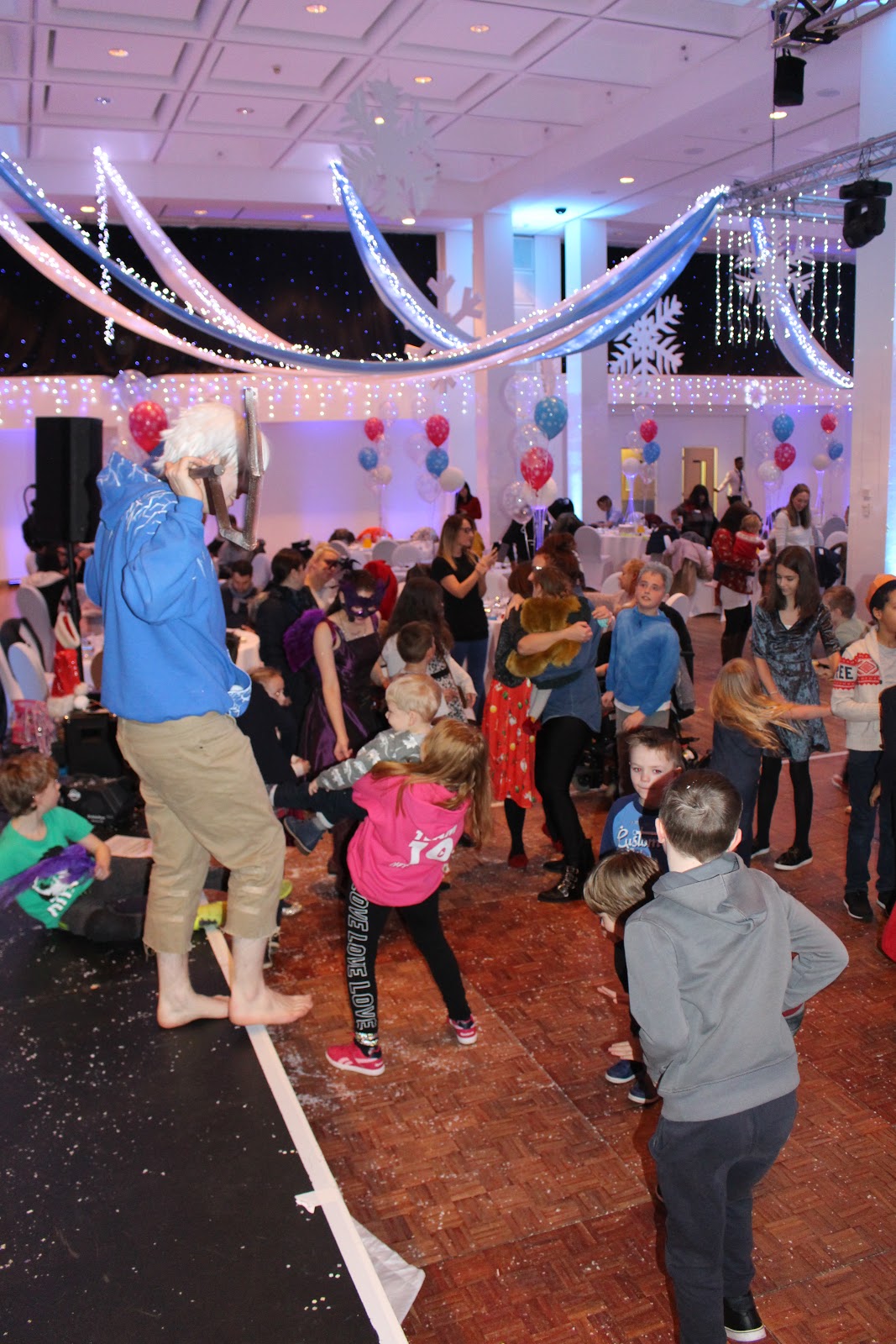 The party being held at The Royal Armouries in Leeds meant that it was certainly in style. The Ball Room was decked out ready for the New Years Party and was certainly glamorous. And it also very conveniently fitted in with our Rise of the Guardians theme this year! A lovely touch was the red carpet entrance we were treated to! As always – a MASSIVE thank you to the Royal Armouries for allowing us to host our party there. Alison from Celebration Balloons returned as well to apply the finishing touches to the decorations. Her balloons graced each of the 22 tables and she also designed a Balloon Wall to be used as a backdrop for family photos.